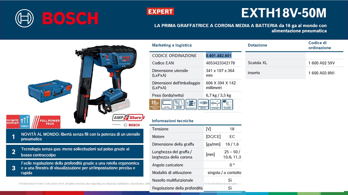 The Bosch Expert EXTH 18V-50 M – naked stapler/nailer is designed for fast, precise, and repeatable fastenings on wood and panels, without the hassle of compressors or hoses. Ideal for assembly, paneling, and light carpentry, it allows you to work at a constant pace and with controlled impact , even on exposed work.